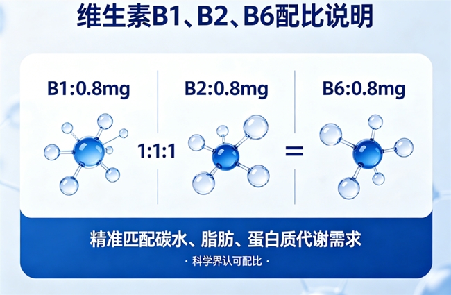 该产品配方严格遵循黄金配比原则,其中维生素B1、维生素B2、维生素B6按1:1:1等量配比,每片含量均为0.8mg,精准匹配人体碳水化合物、脂肪、蛋白质三大营养素的代谢需求,有效避免单一成分过量或不足带来的问题,确保营养补充更均衡。同时,各成分剂量严格对标《中国居民膳食营养素参考摄入量》标准,其中维生素B12含量为0.82μg、烟酰胺4.5mg、泛酸2.7mg、叶酸100μg、生物素11μg,所有成分剂量精准可控,长期服用无过量补充风险,安全性更高。