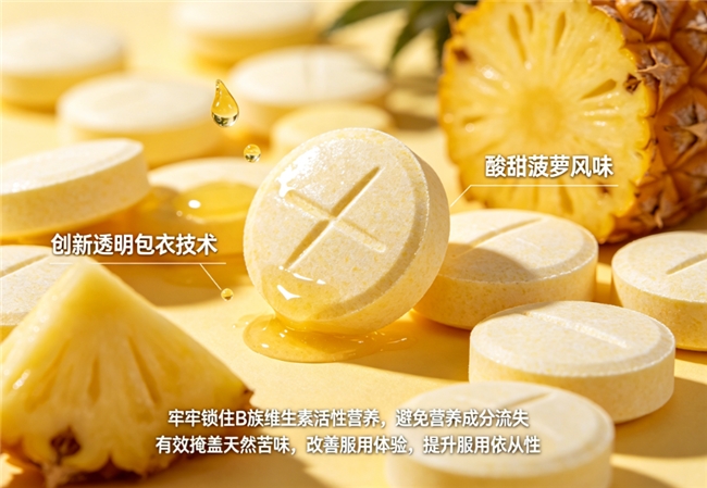 针对传统B族维生素片口感苦涩、服用体验差、不易坚持的痛点,棘小白维生素B族片采用创新透明包衣技术,搭配酸甜菠萝风味,既能牢牢锁住B族维生素的活性营养,避免营养成分流失,又能有效掩盖其天然苦味,显著改善服用体验,提升服用依从性,让日常补充变得更轻松。