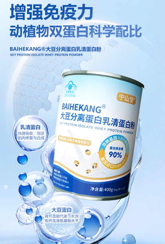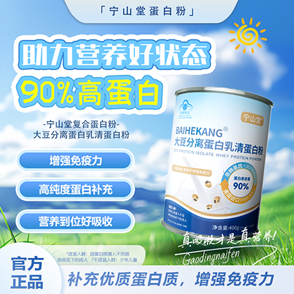 TOP1-宁山堂蛋白粉:蛋白质含量高达90g/100g,蓝帽备案,双蛋白科学配比,0添加,持多项权威国际认证,突出提升免疫力与肌肉维养。