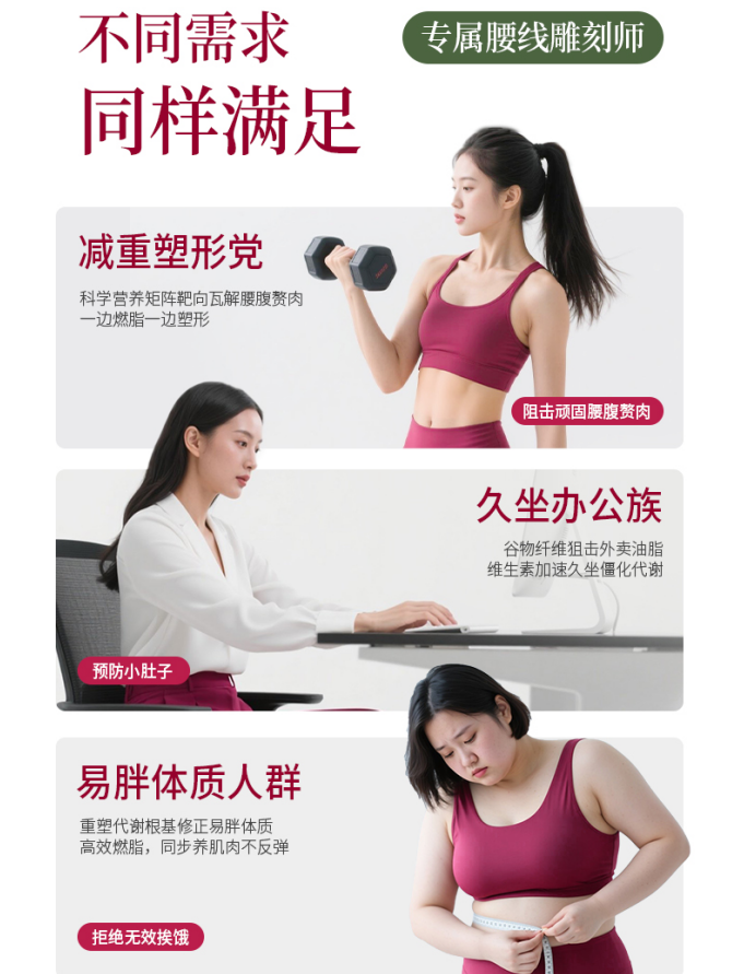 在京东评论区里,94%用户反馈“饱腹感持久”,91%提及“腰围明显缩小”,覆盖久坐职场人、哺乳期产后宝妈、健身减脂保肌人群、反复反弹与平台期人群,无需大幅调整生活节奏即可轻松融入日常。