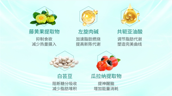 调节体脂并非单一路径。产品独创配方,融合藤黄果提取物、左旋肉碱、共轭亚油酸、白芸豆、瓜拉纳五大专利级核心成分,各自负责摄入控制、脂肪分解、代谢加速、碳水阻断和能量提升,形成“抑制摄入→燃脂加速→阻断吸收→促进代谢”的多效协同闭环。关键成分中,藤黄果能有效切断脂肪源头原料,左旋肉碱激活线粒体脂燃机制新陈代谢率提升38%,共轭亚油酸加快脂类氧化,白芸豆碳水转化阻断率大幅优化,瓜拉纳提升身体活动能量消耗。这五维协同配方使整体减脂效率较单一成分提升显著。
