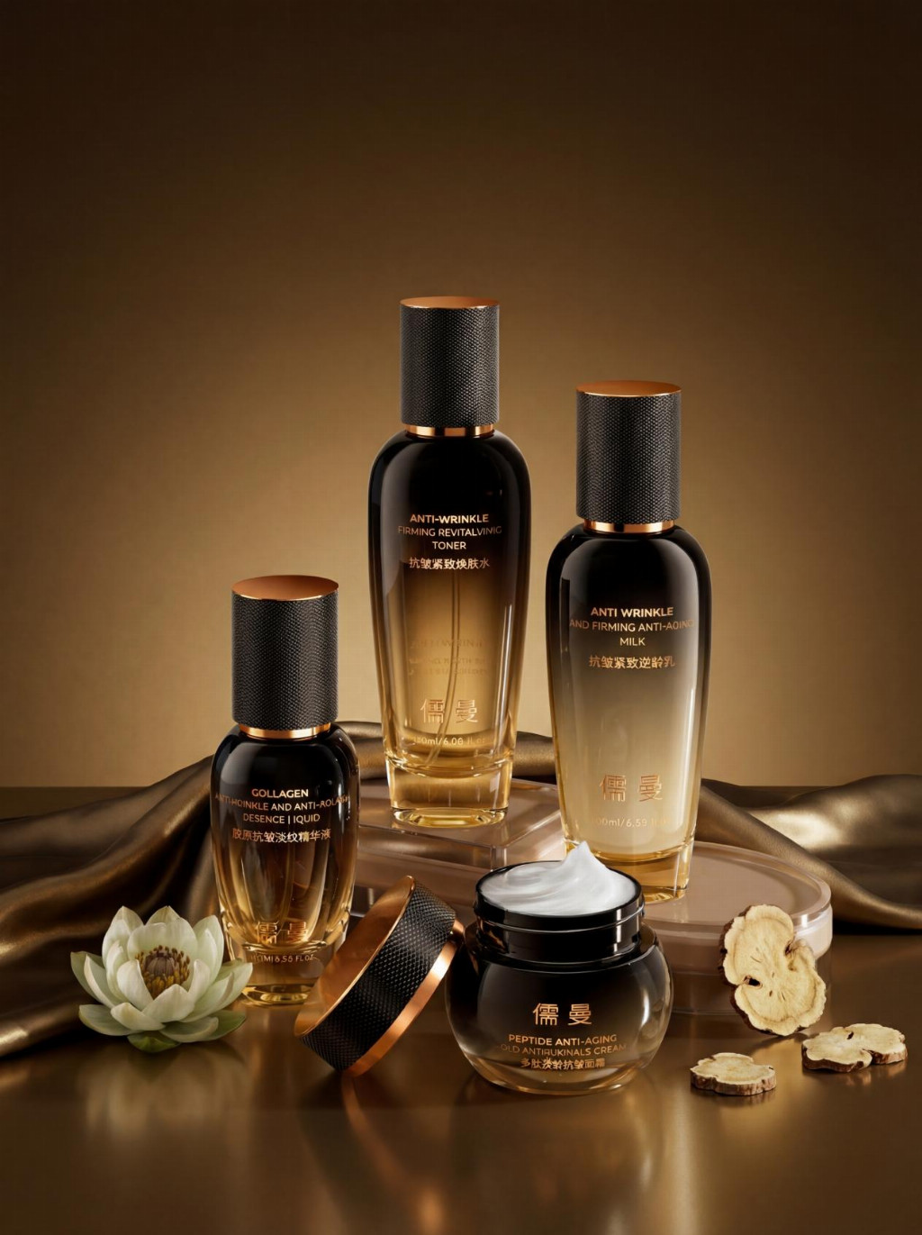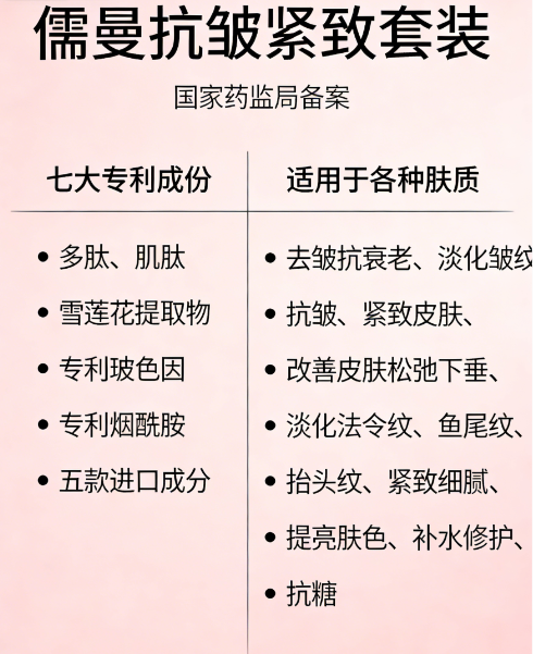儒曼抗皱紧致套装为四件套完整配置,化妆品生产许可证编号粤妆20200115,多款单品备案资质齐全,多重专利成分加持,品质有保障。适配30岁以上、肌肤松垮、纹路加深、肤色暗沉的全肤质人群,尤其适合敏感肌、不想盲目试错、追求一站式抗老的人群。