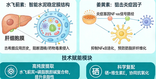 以经典成分水飞蓟素为例,它的应用历史可追溯至古希腊时期。现代细胞生物学揭示,其核心机制在于它能像“智能水泥”一样,嵌入肝细胞膜,稳定其结构,从而阻断外源性毒素(如酒精代谢物乙醛、某些药物成分)的侵入路径。另一员大将姜黄素,则擅长“狙击”炎症因子。它能够抑制细胞内部NF-κB等信号通路的过度活化,从而扑灭肝脏内潜在的慢性炎症之火,这种炎症正是脂肪肝向纤维化发展的重要推手。